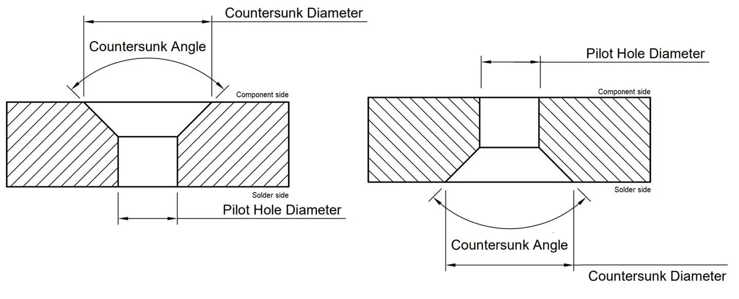 Countersunk is basically creating a conical-shaped indentation on the surface of a hole, typically for the purpose of allowing a screw or bolt to sit flush with the surface of the PCB.This process is commonly used in electronic assembly to ensure that there are no obstructions or protrusions that may interfere with the mounting of other components or devices on the PCB.The countersunk hole is created by drilling a larger diameter hole at the top of the hole, and then gradually tapering the diameter down towards the bottom of the hole.This creates a conical-shaped hole that can accommodate the head of a screw or bolt, allowing it to sit flush with the surface of the PCB.
